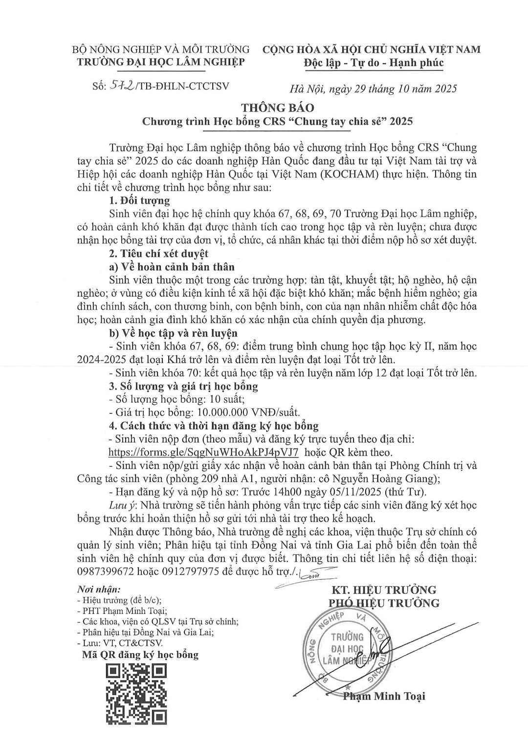 Trường Đại học Lâm nghiệp thông báo về chương trình Học bổng CRS “Chung tay chia sẻ” 2025, do các doanh nghiệp Hàn Quốc đang đầu tư tại Việt Nam tài trợ và Hiệp hội các doanh nghiệp Hàn Quốc tại Việt Nam (KOCHAM) thực hiện.
