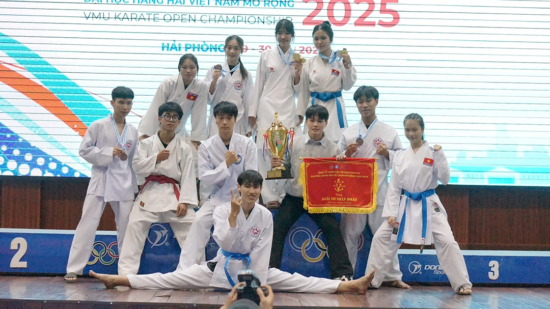 Tập thể CLB Karatedo xuất sắc nhận Cờ và Cúp Giải Nhì toàn đoàn tại Giải vô địch Karate Đại học Hàng Hải mở rộng 2025