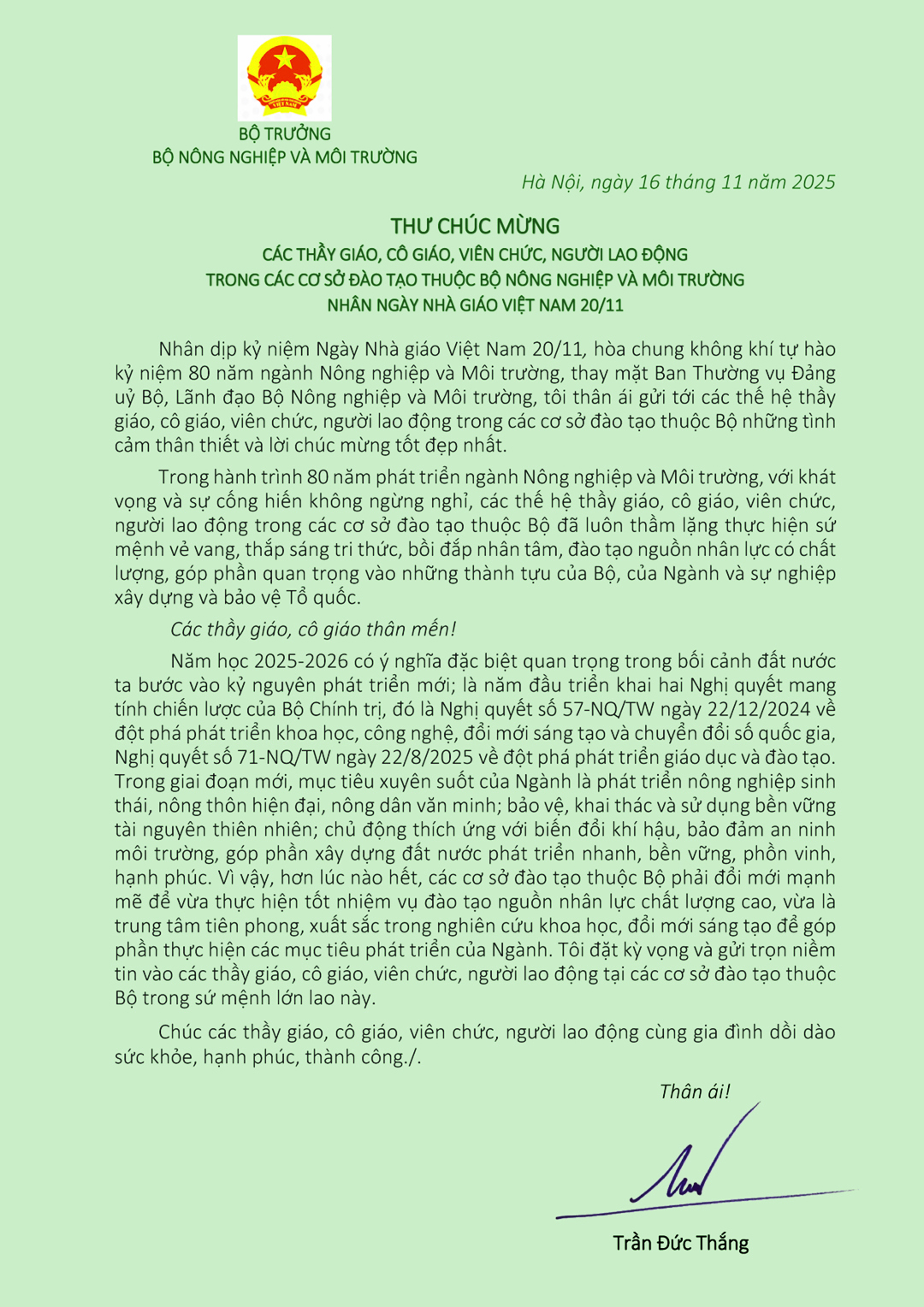 Thư chúc mừng các thầy giáo, cô giáo, viên chức, người lao động trong các cơ sở đào tạo thuộc Bộ Nông nghiệp và Môi trường nhân Ngày Nhà giáo Việt Nam 20/11