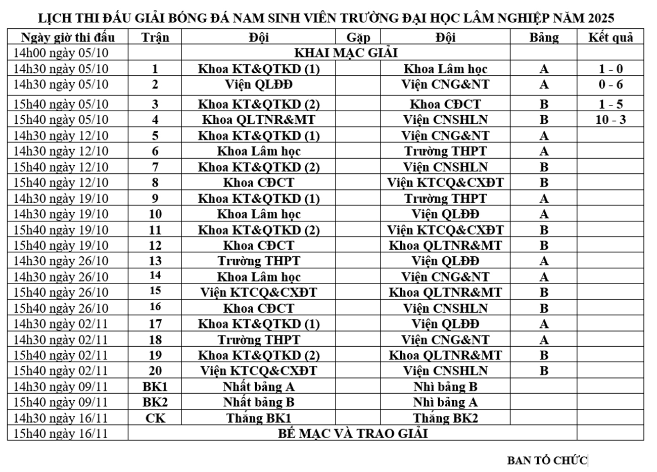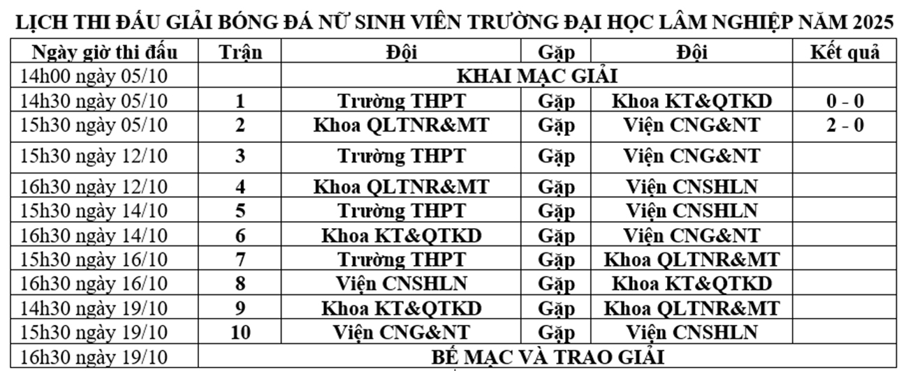 Kết quả những trận thi đấu trong ngày đầu tiên và lịch thi đấu giải bóng đá nam, nữ sinh viên trường Đại học Lâm nghiệp năm 2025. Giải đấu hứa hẹn sẽ mang đến nhiều trận cầu hấp dẫn, là nơi để các cầu thủ thể hiện tài năng, bản lĩnh cũng như tinh thần fair-play cao thượng. Đồng thời, đây cũng là dịp để các đơn vị giao lưu, học hỏi, thắt chặt tinh thần đoàn kết trong toàn Trường.