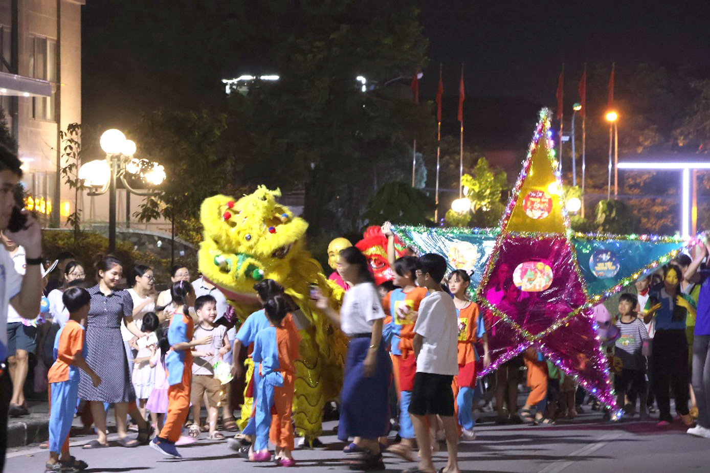 Đêm hội chính thức bắt đầu lúc 19h30 với màn diễu hành rước đèn ông sao và múa lân rực rỡ sắc màu. Hàng trăm em nhỏ trong những bộ trang phục đẹp mắt, tay cầm đèn lồng lung linh, hòa mình vào điệu nhạc tưng bừng cùng các màn biểu diễn uyển chuyển, mạnh mẽ của đội múa lân. Đoàn rước như một dòng sông ánh sáng len lỏi khắp khuôn viên Trường, khởi hành từ sảnh Nhà A1 và hội tụ về Hội trường G5, mang đến không khí của một đêm hội Trăng Rằm trọn vẹn và ý nghĩa.